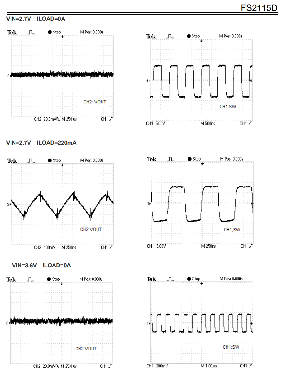 新的电荷泵架构将恒定的开关频率维持在零负载,并降低输出和输入纹波。FS2115D 具有热关断功能,可以承受从 VOUT 到 GND 的连续短路。 内置软启动电路可防止启动期间浪涌电流过大。