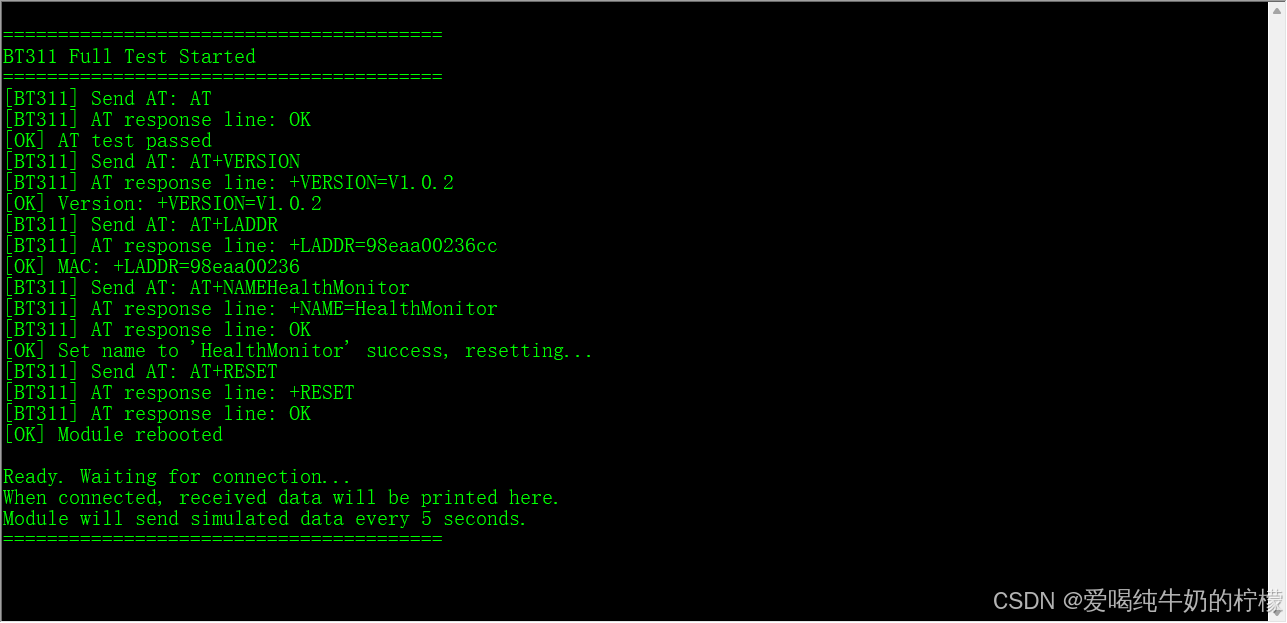 提供全功能测试函数,自动完成初始化、AT测试、版本查询、MAC读取、名称设置、连接状态检测、数据收发打印,方便快速验证。
