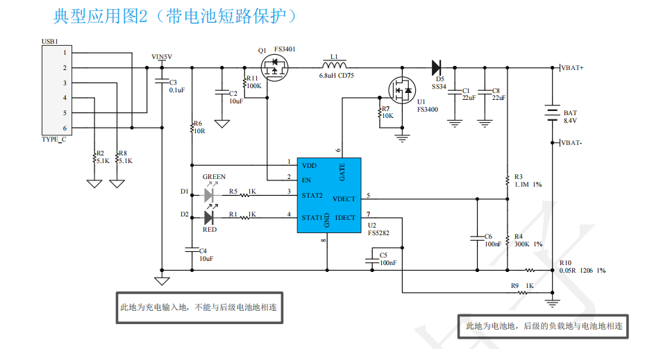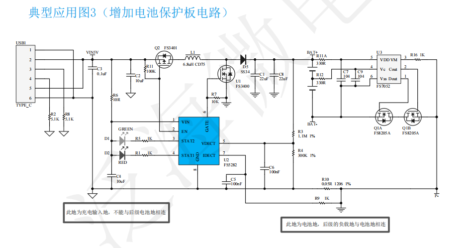 FS5282是一款可使用目前市面上通用的普通 USB5V 电源给多串锂电池充电的集成电路。恒流电流由连接于芯片 GND 和电池负极间的R10电流检测电阻来设定。充电电流由内部基准和外部的R10阻值来设定,内部基准是 50mV 。即恒流充电值为:ICC =0.05V/R10恒压充电值通过电阻 R3 和 R4 分压网络反馈到 FB 管脚上,FS5282 根据 FB管脚上的电压决定充电状态。恒压值设定公式为:VBAT=1.8×(R3+R4)/R4自动再充电是在电池饱后电池电压电池电压低于设定值时,则再次开启升压充电对电池充电。自动再充电值公式为:VBAT=1.73×(R3+R4)/R4