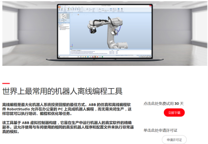 还原:ABB官方RobotStudio下载页面,顶部标注「全球最常用机器人离线编程工具」,页面核心按钮为「免费试用30天」「立即下载」「申请许可证」。